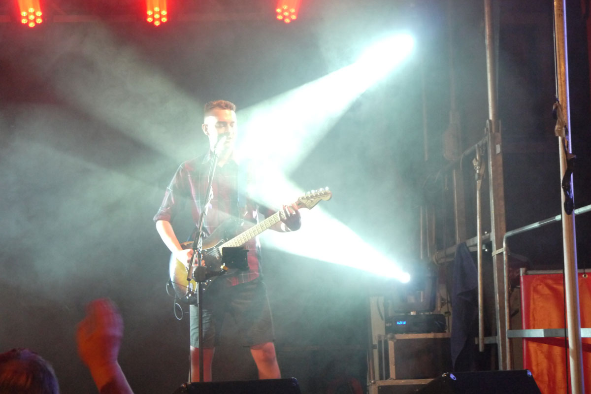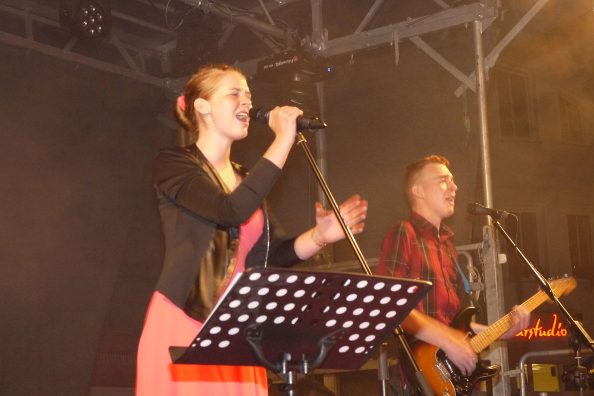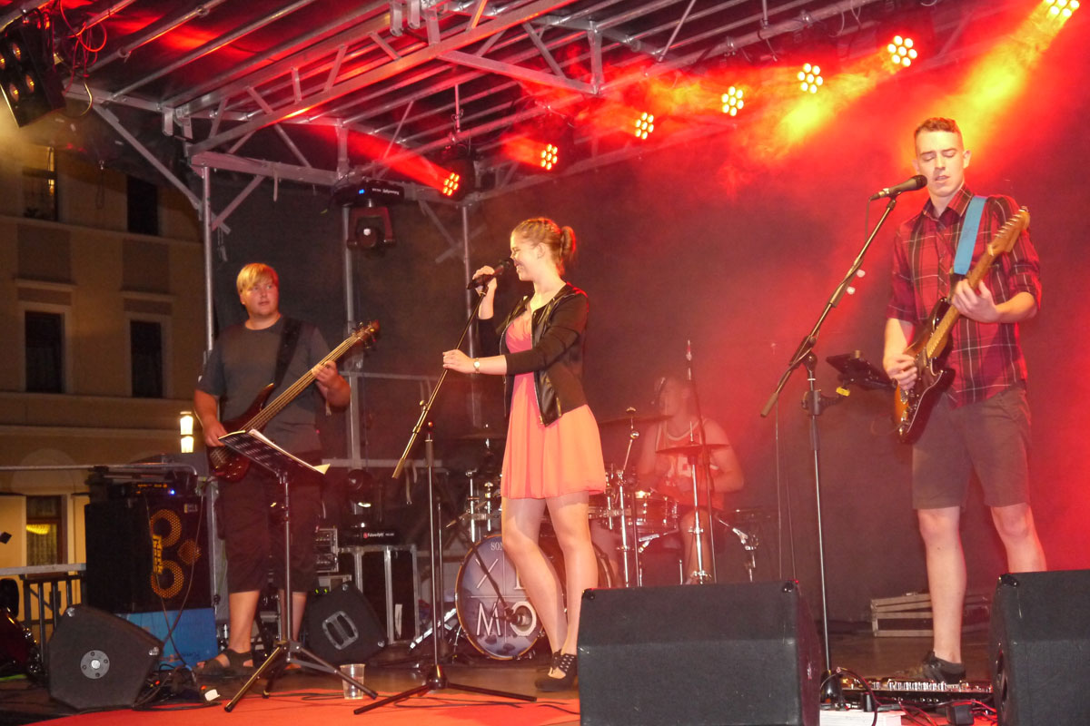 Mit großer Spielfreude rockten Bastian an der Gitarre, Clemens am Bass, Maximilian an den Drums und Bandsängerin Eva vor weit über 1000 Besuchern den Schleizer Neumarkt.