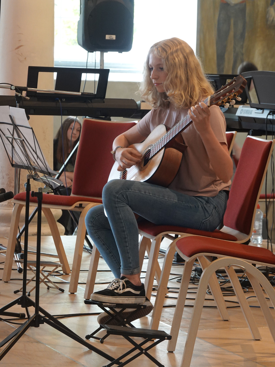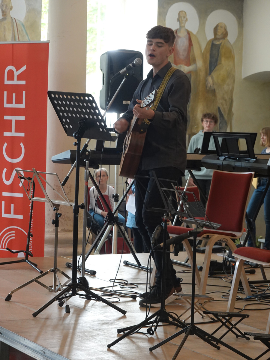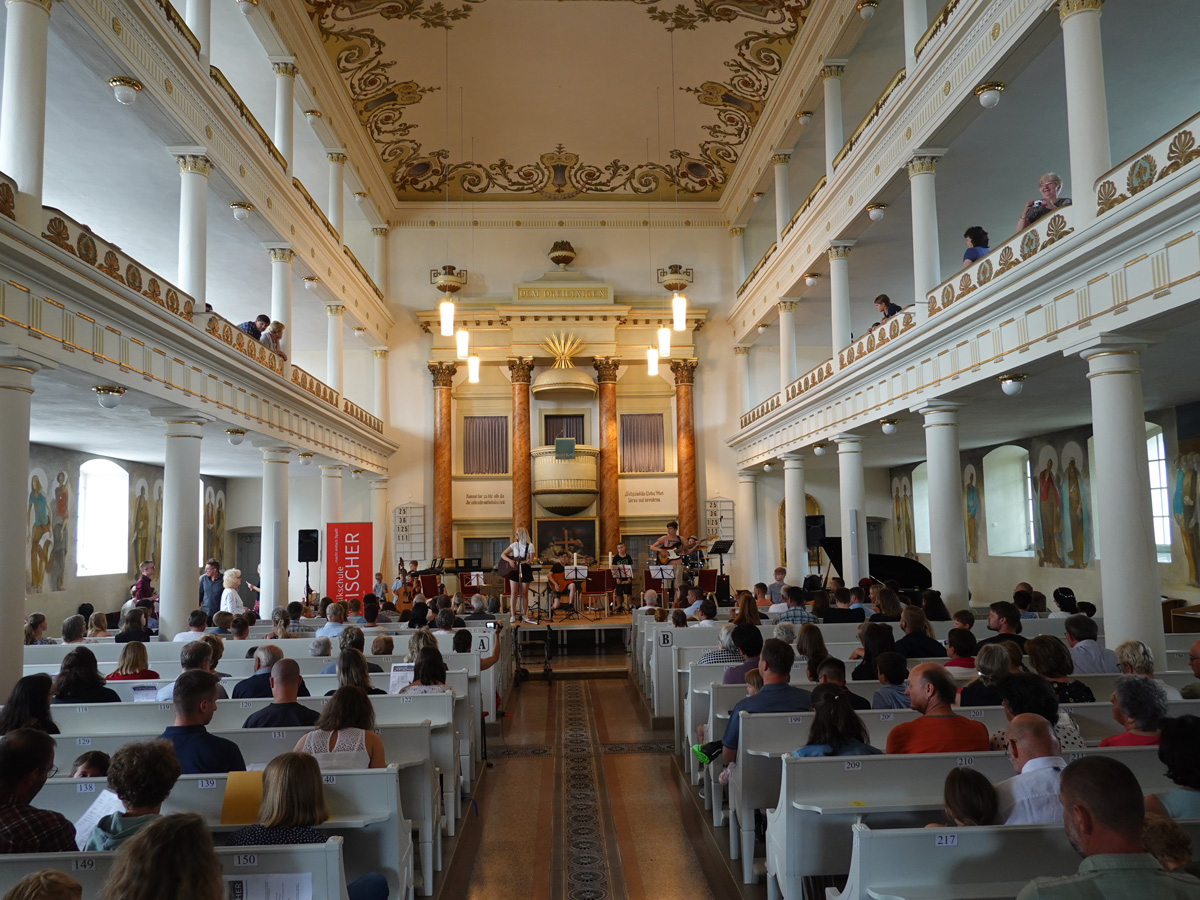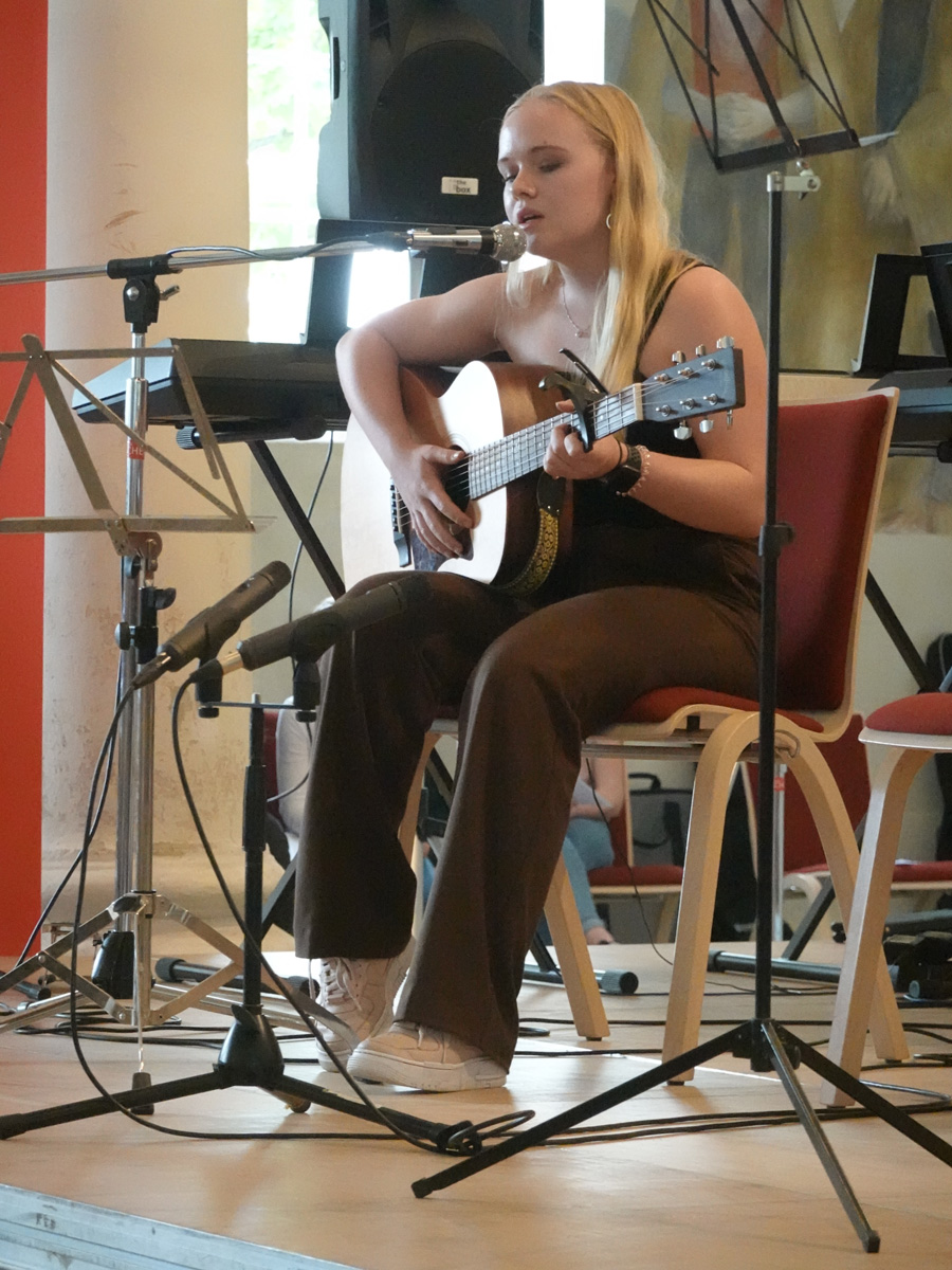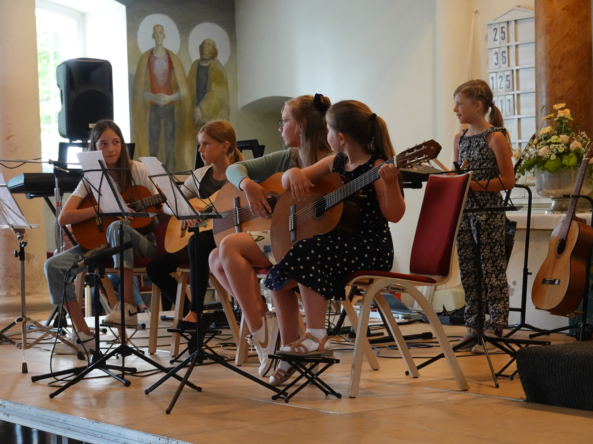 Der Höhepunkt des Konzertnachmittags war aus aktuellem Anlass das Stück „Komm wir ziehen in den Frieden“ von Udo Lindenberg. Dieses wurde in einem großen Ensemble mit Chor, Piano, Altblockflöte, Gitarren und vielen anderen Instrumenten vorgetragen, was zusammen mit der hervorragenden Akustik der Kirche für Gänsehaut beim Publikum sorgte.